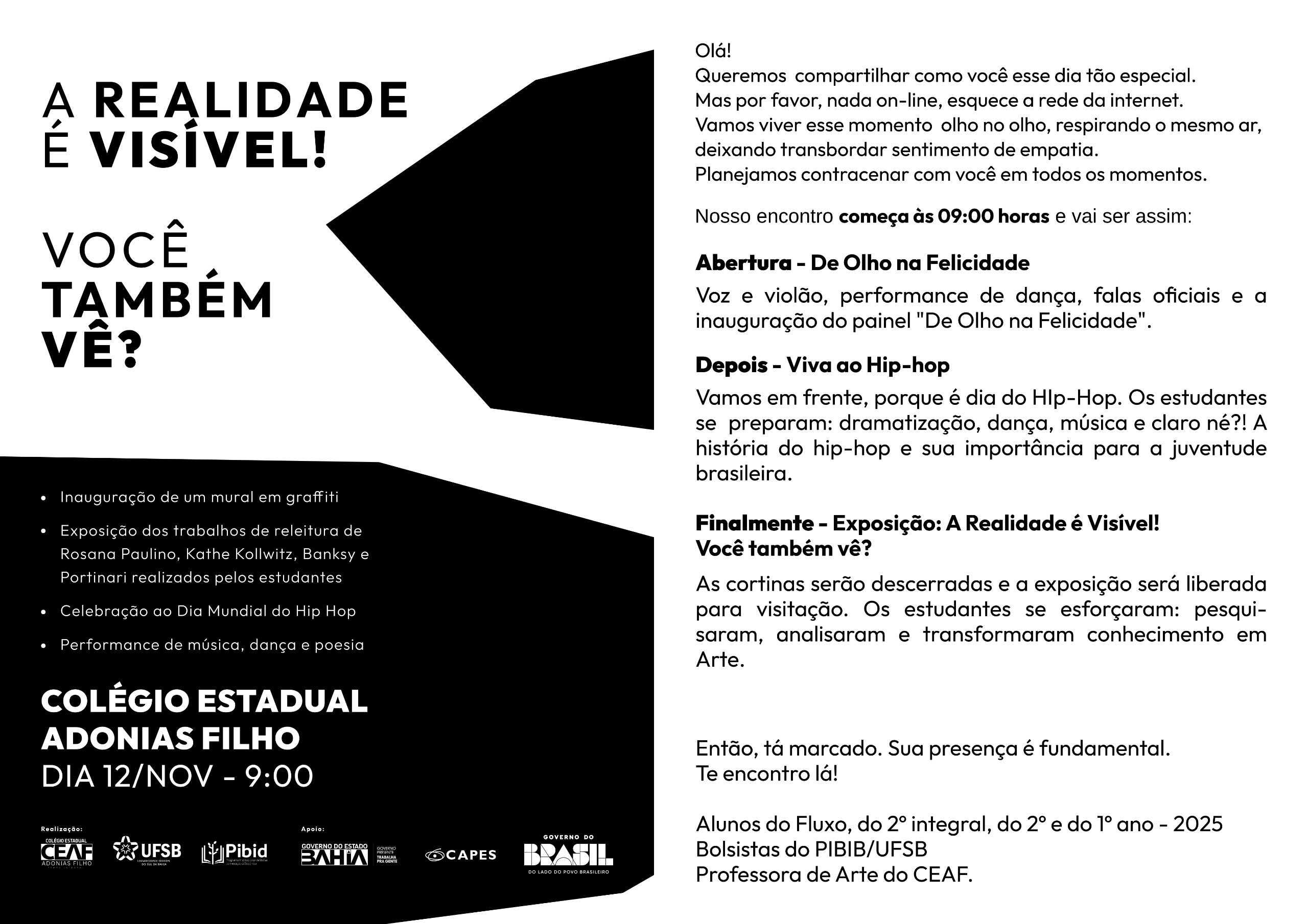 Nesta quarta-feira, 12 de novembro, o Colégio Estadual Adonias Filho, em Itabuna (BA), será palco de um encontro vibrante com a arte, a expressão e a criatividade dos seus estudantes. Sob o tema “A realidade é visível! Você também vê?”, a escola convida toda a comunidade para mergulhar em um dia repleto de manifestações artísticas e culturais.