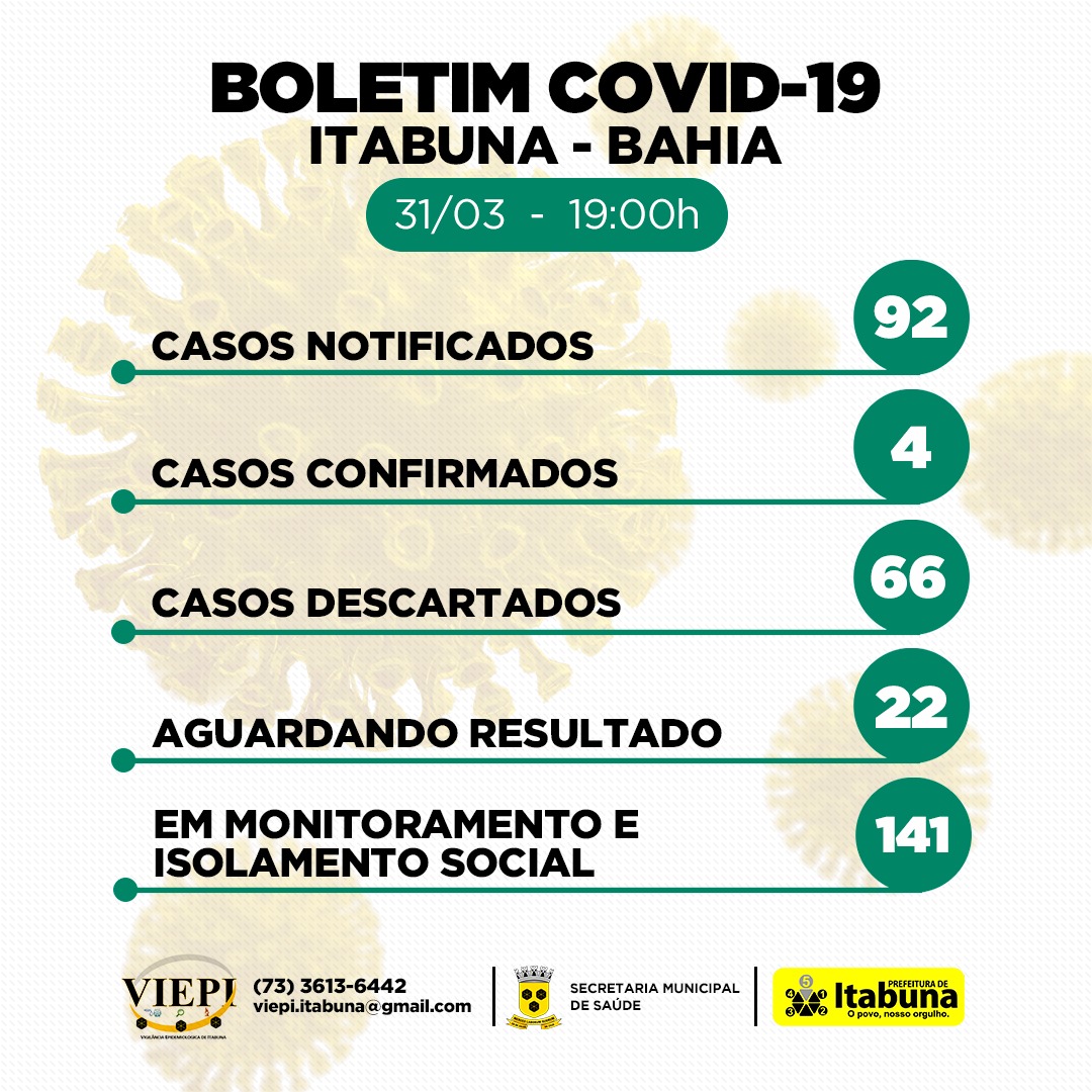 Agora Itabuna contabiliza 92 casos notificados por exames coletados, 66 descartados, 22 aguardando resultado e 141 em monitoramento. Com este novo caso confirmado a cidade passa para quatro casos confirmados da COVID-19. De com informações obtidas pelo blog, o paciente já estava em isolamento social. A idade ainda não foi divulgada.