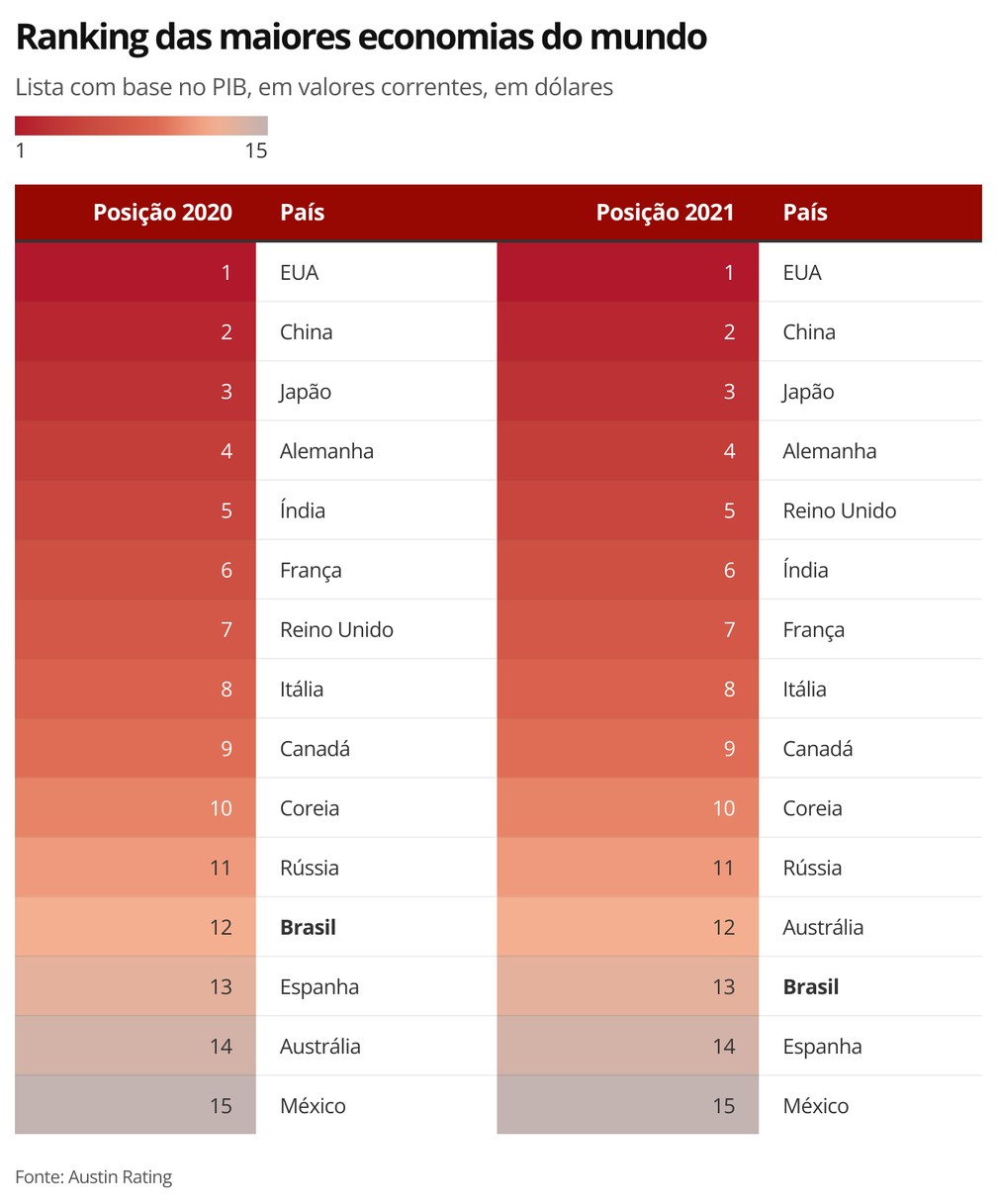 Mesmo com o crescimento de 4,6% do PIB (Produto Interno Bruto) em 2021, o Brasil caiu de 12º para 13º no ranking das maiores economias do mundo, segundo levantamento da agência de classificação de risco Austin Rating. De acordo com o ranking, que compara o PIB dos países em valores correntes, em dólares, o Brasil foi ultrapassado em 2021 pela Austrália. Em 2020, a economia brasileira já tinha sido superada pelo Canadá, Coreia e Rússia, o que tirou o país da lista das 10 maiores economias do mundo. O Brasil teve no ano passado um PIB nominal de US$ 1,608 trilhão, segundo o levantamento, enquanto que o da Austrália ficou em US$ 1,614 trilhão.
