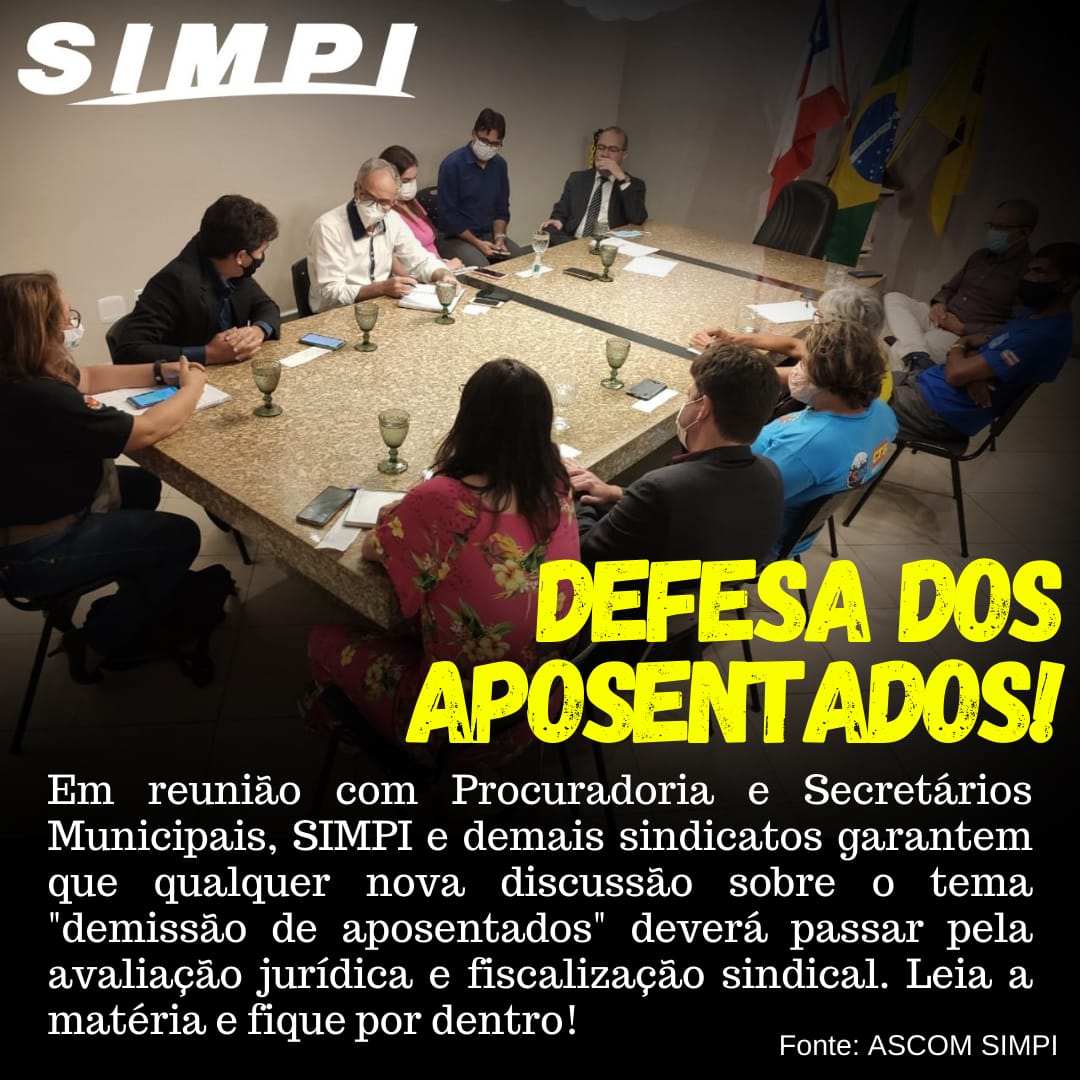O Sindicato do Magistério – SIMPI, preocupado com o bem estar emocional e a proteção dos direitos de todos os professores, assim que tomou ciência das especulações envolvendo a demissão de servidores aposentados, solicitou uma audiência com o Governo para discussão e esclarecimento do assunto. Neste sentido, na manhã desta segunda-feira, 04/10, reuniram-se no Gabinete do Prefeito, o Procurador Municipal, Dr. Álvaro Luiz, o Secretário de Governo, Júnior Brandão, a Secretária de Saúde, Dra. Lívia Mendes, e o Secretário de Gestão e Inovação, José Alberto Filho para discutir com as representações sindicais dos quatro segmentos públicos municipais (SIMPI, SINDSERV, SINDIACS/ACE e SINDIGUARDA) alguns aspectos controvertidos sobre o tema.
