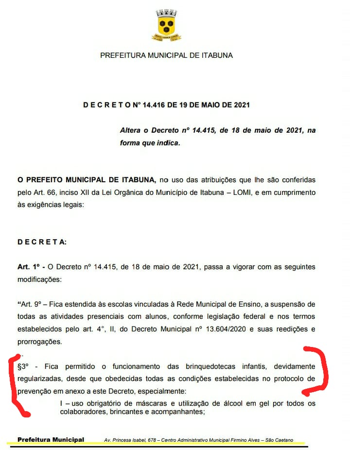 O decreto informa que as atividades presenciais em toda a rede municipal estão suspensas, o que inclui as creches da cidade, mas em seguida autoriza o funcionamento das brinquedotecas infantis com limitação na ocupação de presentes e uso de máscara e álcool gel.