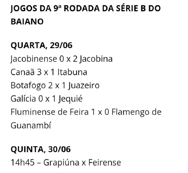 Com o resultado, o Jacobinense foi aos 19 pontos ganhos, na primeira colocação. O Tricolor das Carrancas (Juazeiro), por sua vez, se manteve na vice-liderança, agora com 16 pontos.