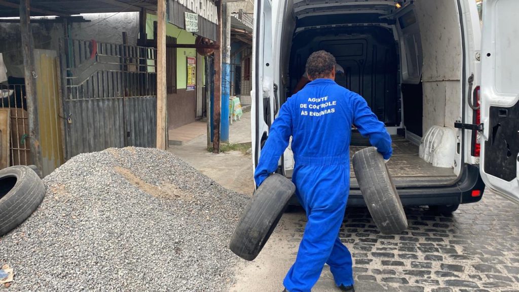 Na tarde da quarta-feira passada, dia 8, por exemplo, numa atividade de campo, foram recolhidos mais de 300 pneus velhos e outros materiais em desuso nas borracharias pelos Agentes de Combate às Endemias do Departamento de Vigilância a Endemias da Secretaria Municipal de Saúde.