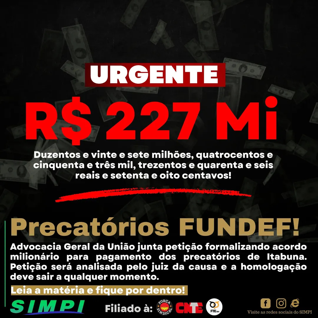 A Advocacia Geral da União (AGU) juntou nesta quinta-feira, 04/12 uma petição nos autos do processo nº 0007713-50.2017.4.01.3400 confirmando o acordo firmado com o Município de Itabuna para o levantamento de R$ 227.453.346,78 (duzentos e vinte e sete milhões, quatrocentos e cinquenta e três mil, trezentos e quarenta e seis reais e setenta e oito centavos) referentes aos precatórios do FUNDEF.