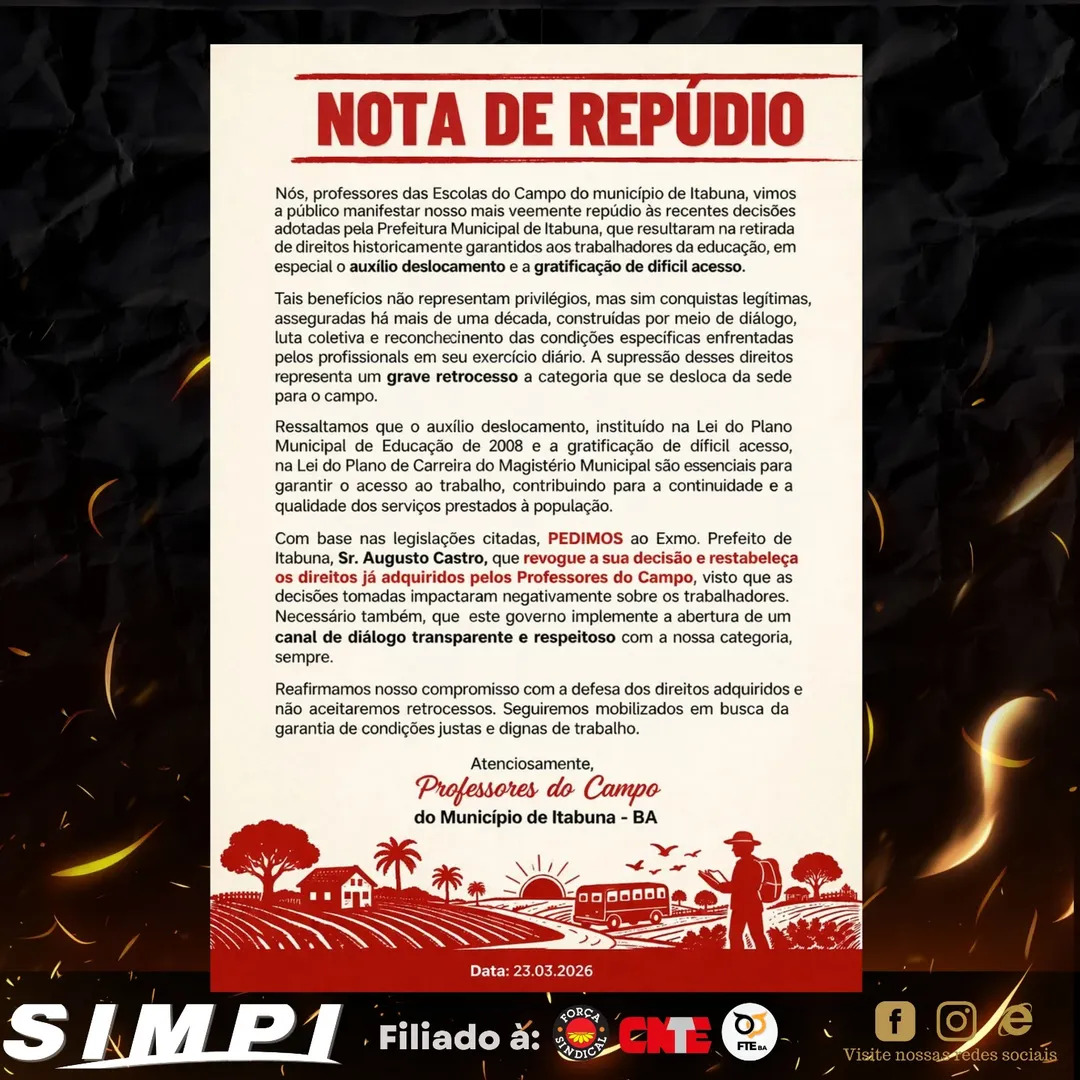 Os professores do campo, de forma mobilizada, emitiram uma Nota de Repúdio nas redes sociais, informando que essa decisão do Governo “representa um grave retrocesso” e pede que o prefeito reestabeleça os direitos já adquiridos pelos professores deste segmento. Além disso, solicitam que a gestão implante a abertura de um canal de diálogo transparente e respeitoso, uma vez que as decisões estão sendo tomadas de modo unilateral e sem qualquer negociação.