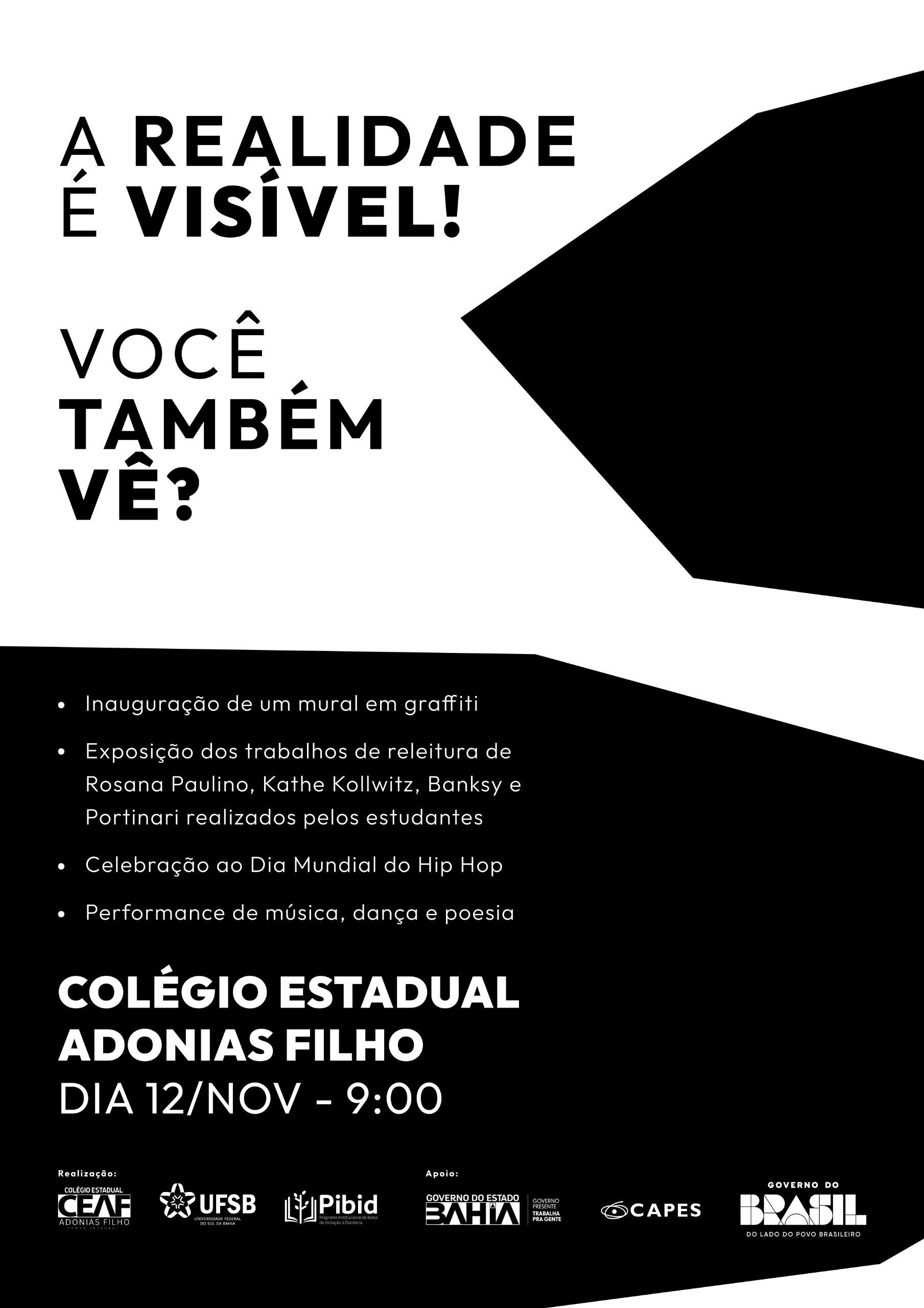 Nesta quarta-feira, 12 de novembro, o Colégio Estadual Adonias Filho, em Itabuna (BA), será palco de um encontro vibrante com a arte, a expressão e a criatividade dos seus estudantes. Sob o tema “A realidade é visível! Você também vê?”, a escola convida toda a comunidade para mergulhar em um dia repleto de manifestações artísticas e culturais.