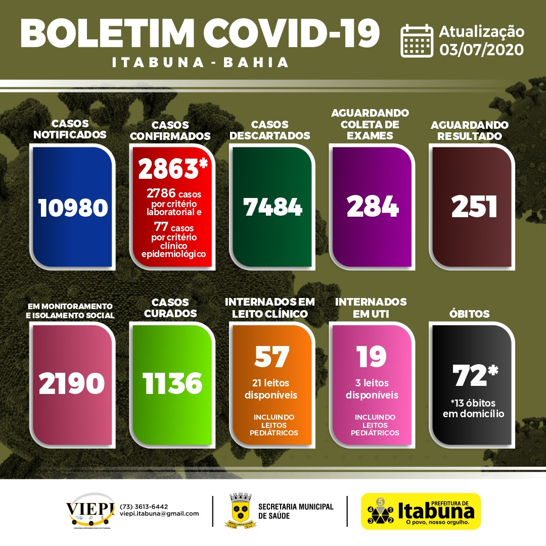 Nesta sexta-feira (03), a Secretaria de Saúde de Itabuna registrou 2.863 casos confirmados do novo coronavírus. Destes, 1.655 casos estão ativos, demonstrando sintomas da doenças.