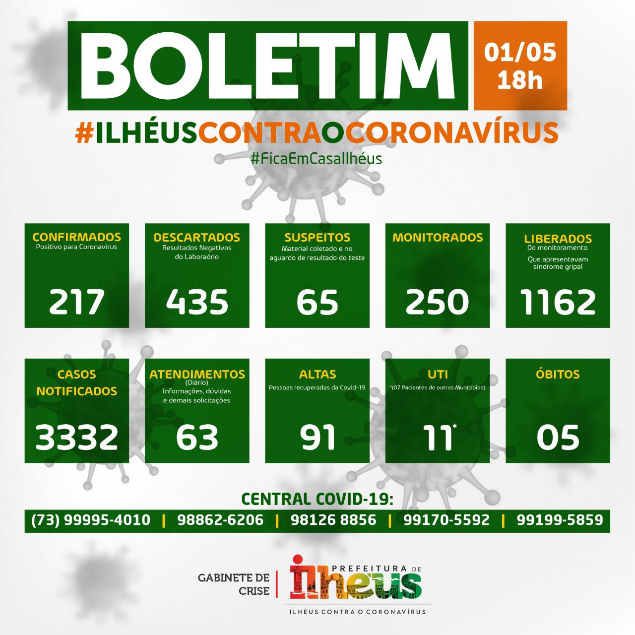 A cidade de Ilhéus registra neste feriado do dia do Trabalhador (1º), 217 casos confirmados do novo Coronavírus (Covid-19). Considerando o número de 91 pacientes recuperados e 250 pessoas permanecem monitoradas pela Vigilância Epidemiológica. Até agora, 435 descartados, 1162 com síndrome gripal leve, 65 aguardando resultado do Lacen, 11 na UTI e infelizmente 05 óbitos.