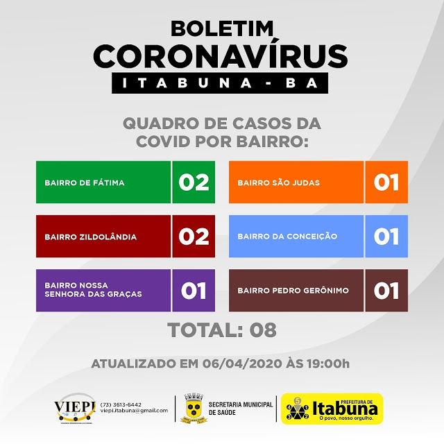 A Vigilância Epidemiológica de Itabuna divulgou um card informativo que traz os bairros de Itabuna, onde moram as oito pessoas infectadas pelo coronavírus, e que tiveram a Covid-19 constatada.
