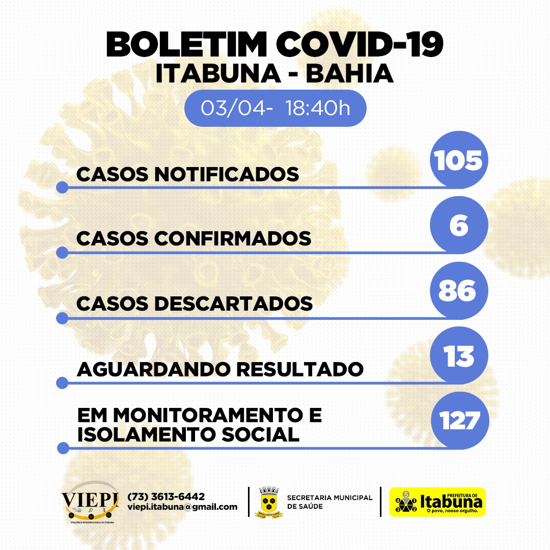 A prefeitura de Itabuna publicou nesta sexta-feira (3), o Boletim Epidemiológico confirmando o sexto caso do novo coronavírus no município. Mais cedo a prefeitura havia confirmado o quinto caso, sendo esse o primeiro de transmissão comunitária. Não se tem até o momento informações deste sexto caso. Em Ilhéus, foi confirmado o décimo caso de Coronavírus.