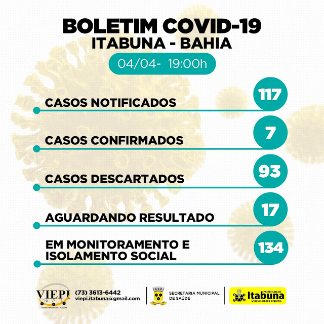A Vigilância Epidemiológica de Itabuna divulgou, na tarde de sábado (04), um novo quadro sobre os casos suspeitos de Covid-19 no município. Itabuna teve mais um caso confirmado e agora são sete pacientes infectados pelo novo coronavírus.